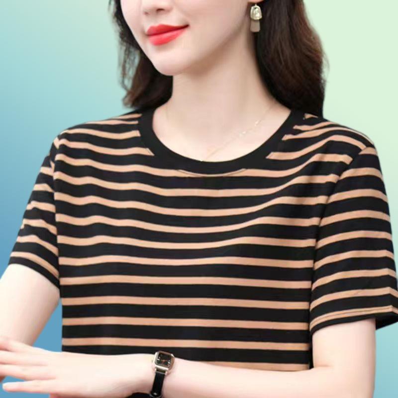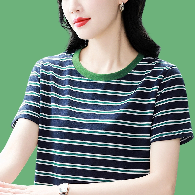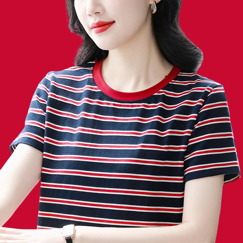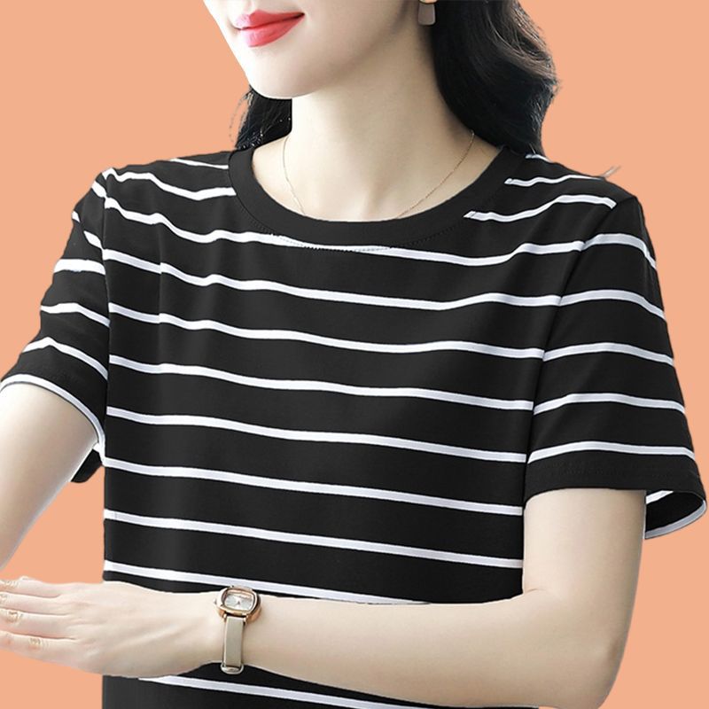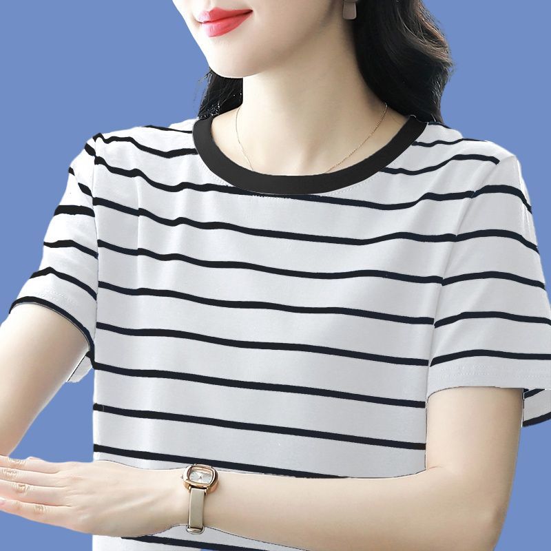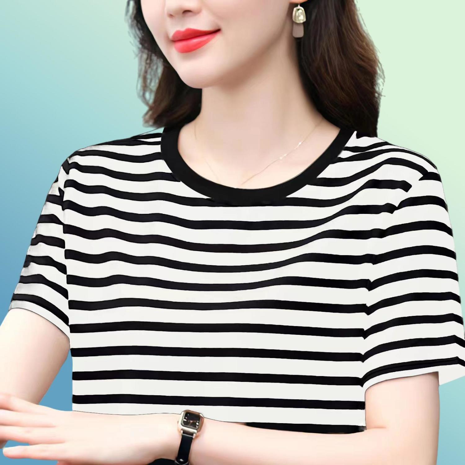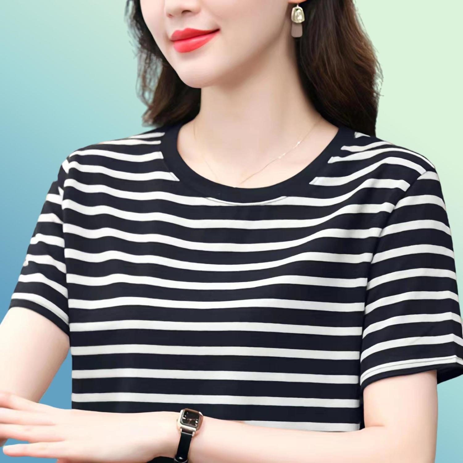 夏季新款大码宽松短袖t恤女士遮肚子黑白条纹体恤小衫纯棉上衣服