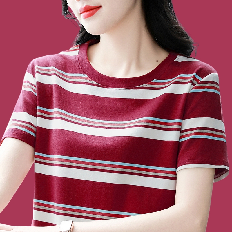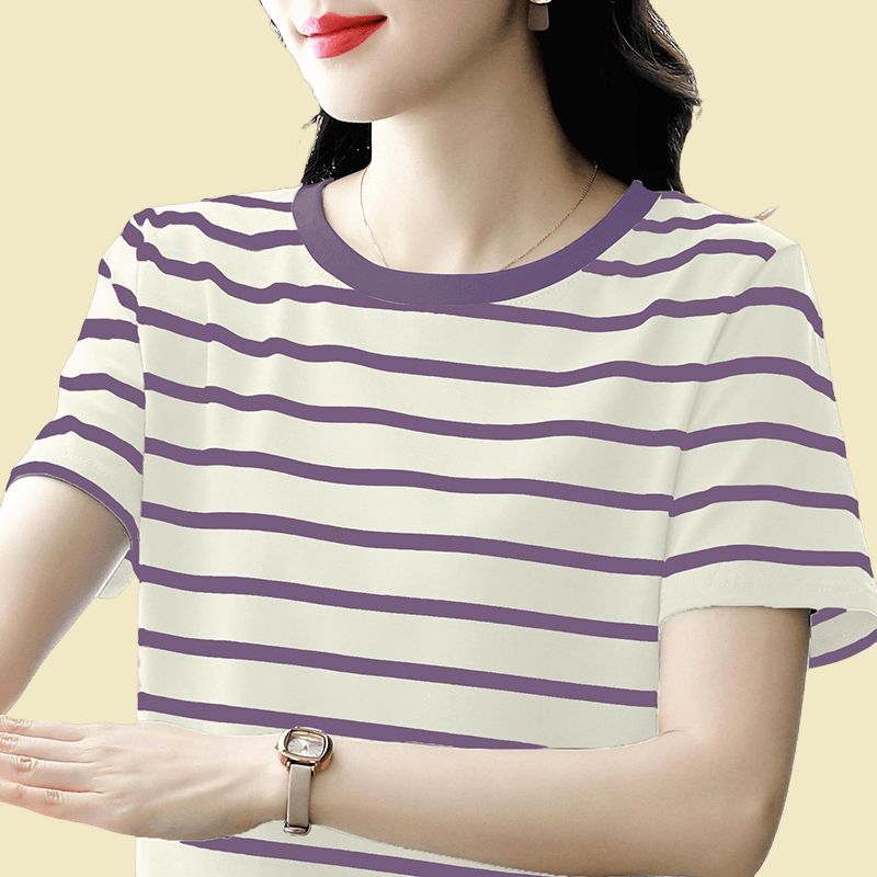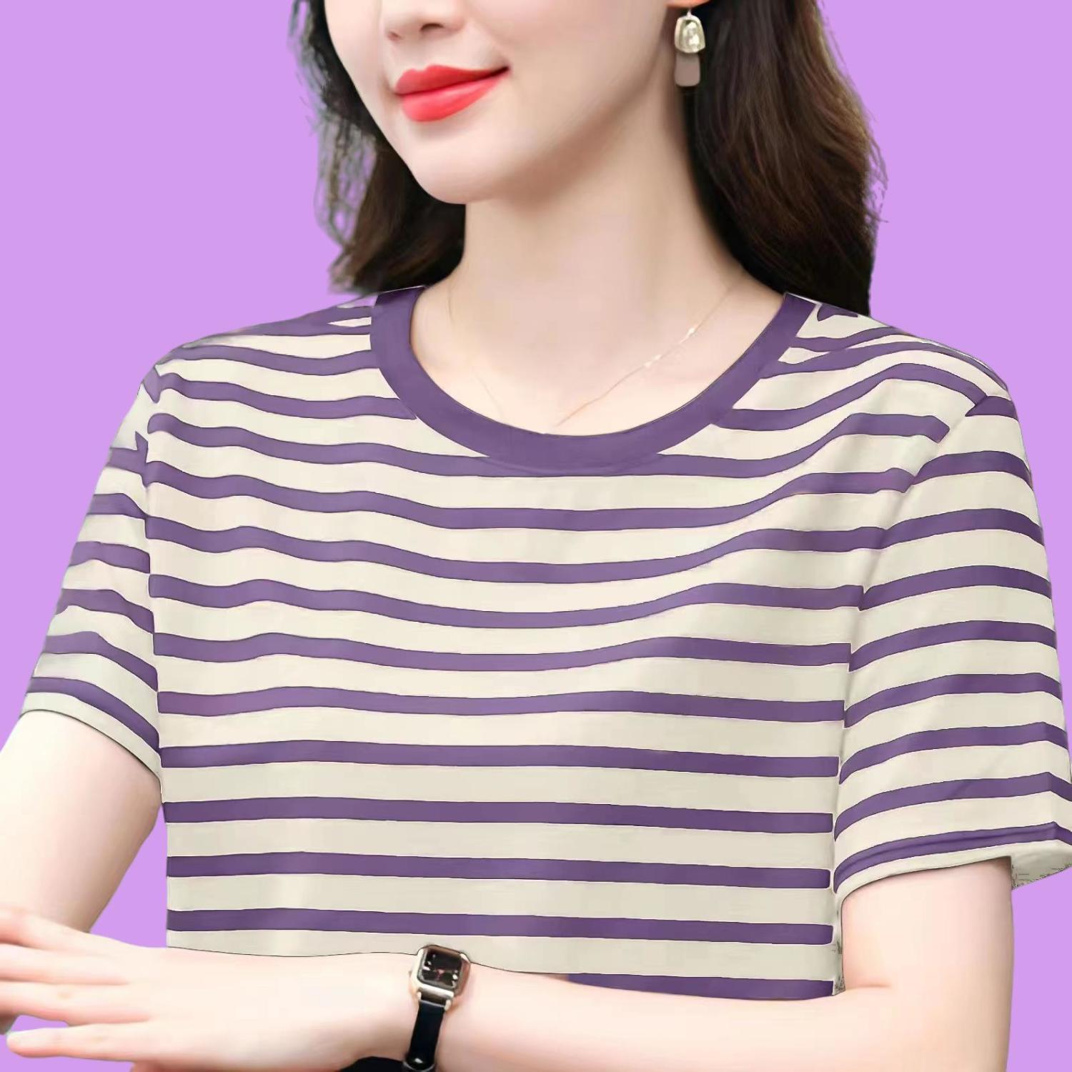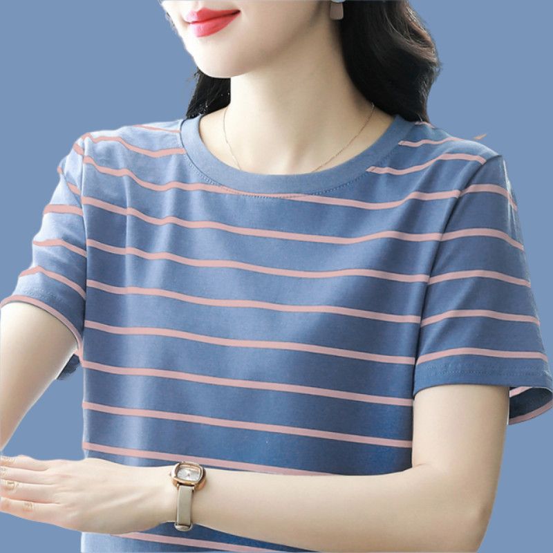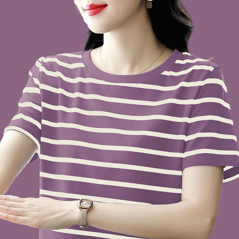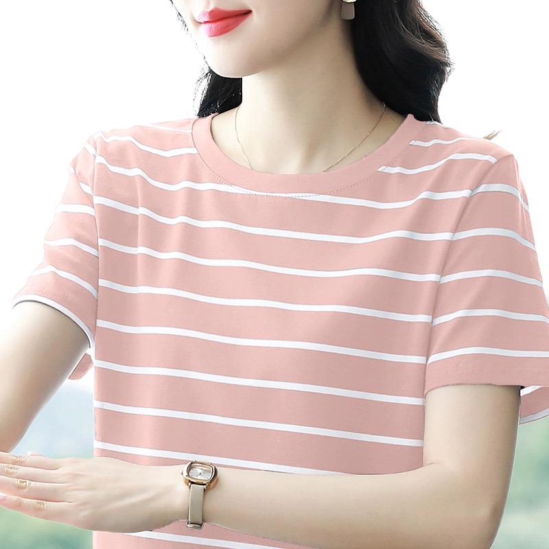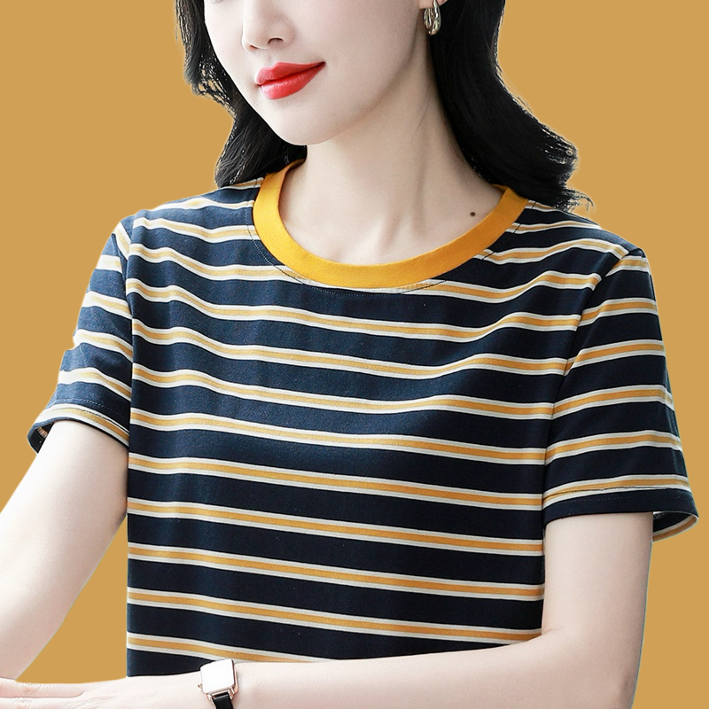 夏季新款大码宽松短袖t恤女士遮肚子黑白条纹体恤小衫纯棉上衣服